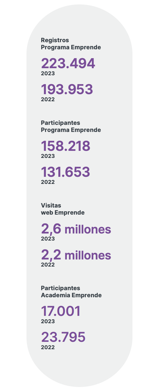 Hemos creado el programa Emprende, el cual entrega orientación y redes a más de 223 mil emprendedores registrados según el rubro y etapa de negocio en la que se encuentran. Emprende cuenta con ejecutivos que prestan asesoría especializada y con una plataforma web llamada “Academia Emprende”, para capacitar a los participantes.