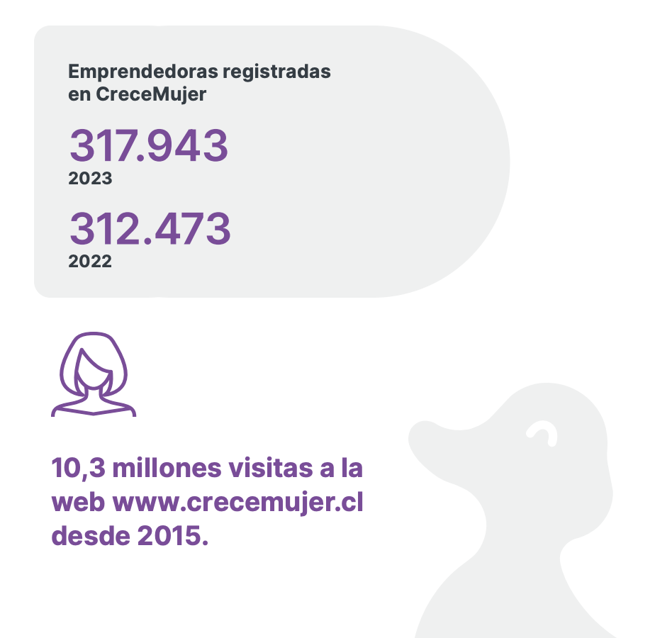 También contamos con el programa CreceMujer, orientado a potenciar el emprendimiento femenino. Este programa es un espacio donde las mujeres reciben orientación y asesoría, así como se les proporcionan redes de contacto con organismos públicos y privados. En 2023 sumamos más de 317 mil emprendedoras registradas en este programa.