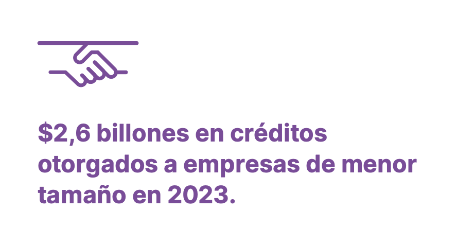 Como parte del rol contracíclico que hemos asumido, nos esforzamos por mejorar las condiciones de financiamiento y servicios no financieros ofrecidas a las empresas de menor tamaño, desplegando plataformas de atención y programas especializados para cada etapa de sus negocios. Es necesario considerar que este segmento representa el 98,6% de las empresas del país y concentran el 65,3% de los empleos formales.