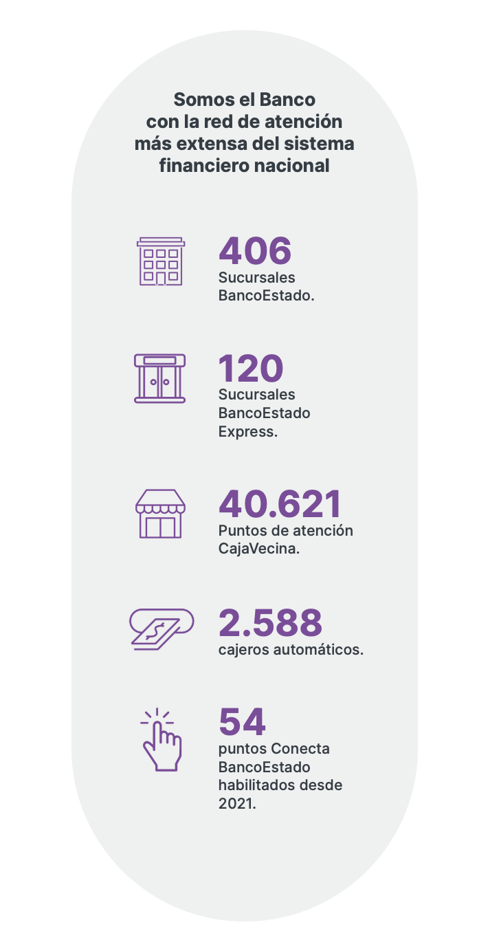Diseñamos modelos de sucursales que hacen factible nuestra presencia en zonas donde no existe oferta bancaria. A través de alianzas, hemos conseguido habilitar sucursales en recintos municipales creando modelos de oficinas pequeñas que permiten entregar soluciones financieras a la comunidad. Como resultado de este esfuerzo por desplegarnos en todo el territorio, somos la única institución financiera con presencia en todas las comunas del país, gracias a una red de 406 sucursales BancoEstado, 120 sucursales de BancoEstado Express, 40.621 puntos de atención CajaVecina y 54 puntos de atención remota Conecta, al cierre del 2023. En 150 comunas somos el único banco presente con una sucursal, otorgando servicios financieros a más de 3,4 millones de habitantes en estas comunas.
