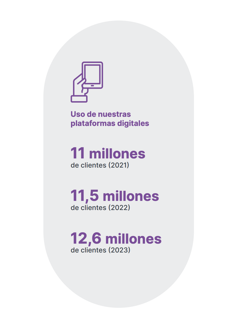 Junto con la cobertura territorial, nuestras plataformas virtuales como el sitio web y la aplicación para celulares, además de nuestro centro de contacto, multiplican las posibilidades de atención para millones de clientes. 12,6 millones de clientes usaron nuestras plataformas digitales y un 90% de las operaciones financieras digitales se realizaron a través de nuestra App móvil, durante 2023. Además de estos canales, contamos con un call center para clientes y la red de cajeros automáticos más grande del país, alcanzando 2.588 cajeros en 2023, que representan más del 33,8% del parque a nivel nacional.