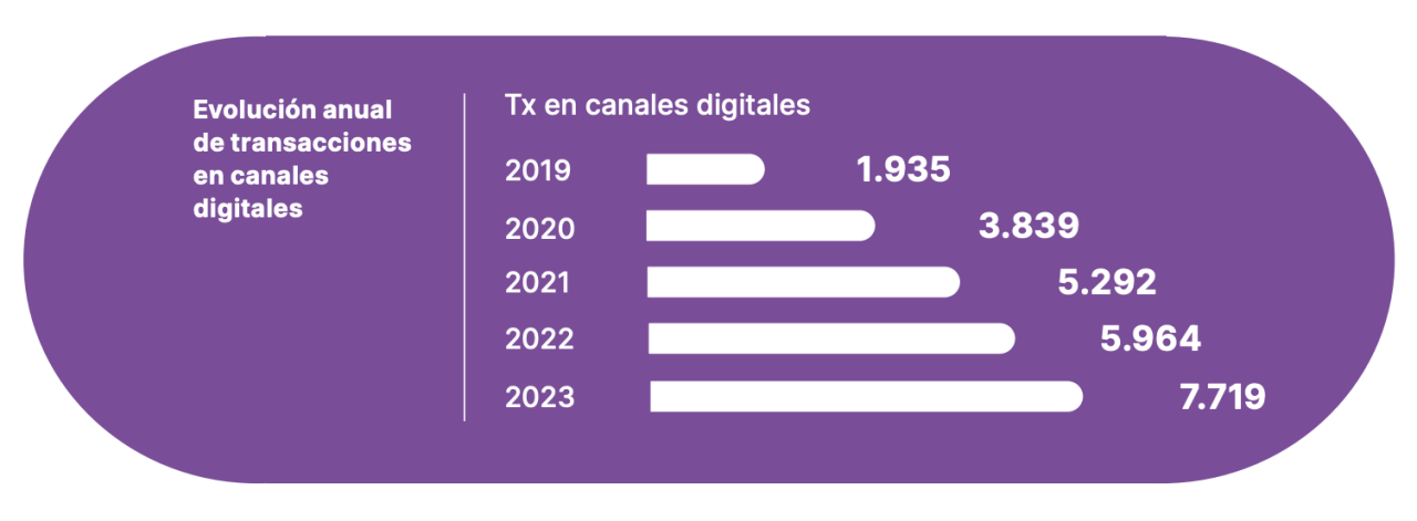 Entre los canales de atención virtual y los presenciales, somos por lejos el banco con el mayor volumen de transacciones a nivel nacional, alcanzando los 834 millones de operaciones como promedio mensual, en el año 2023.
