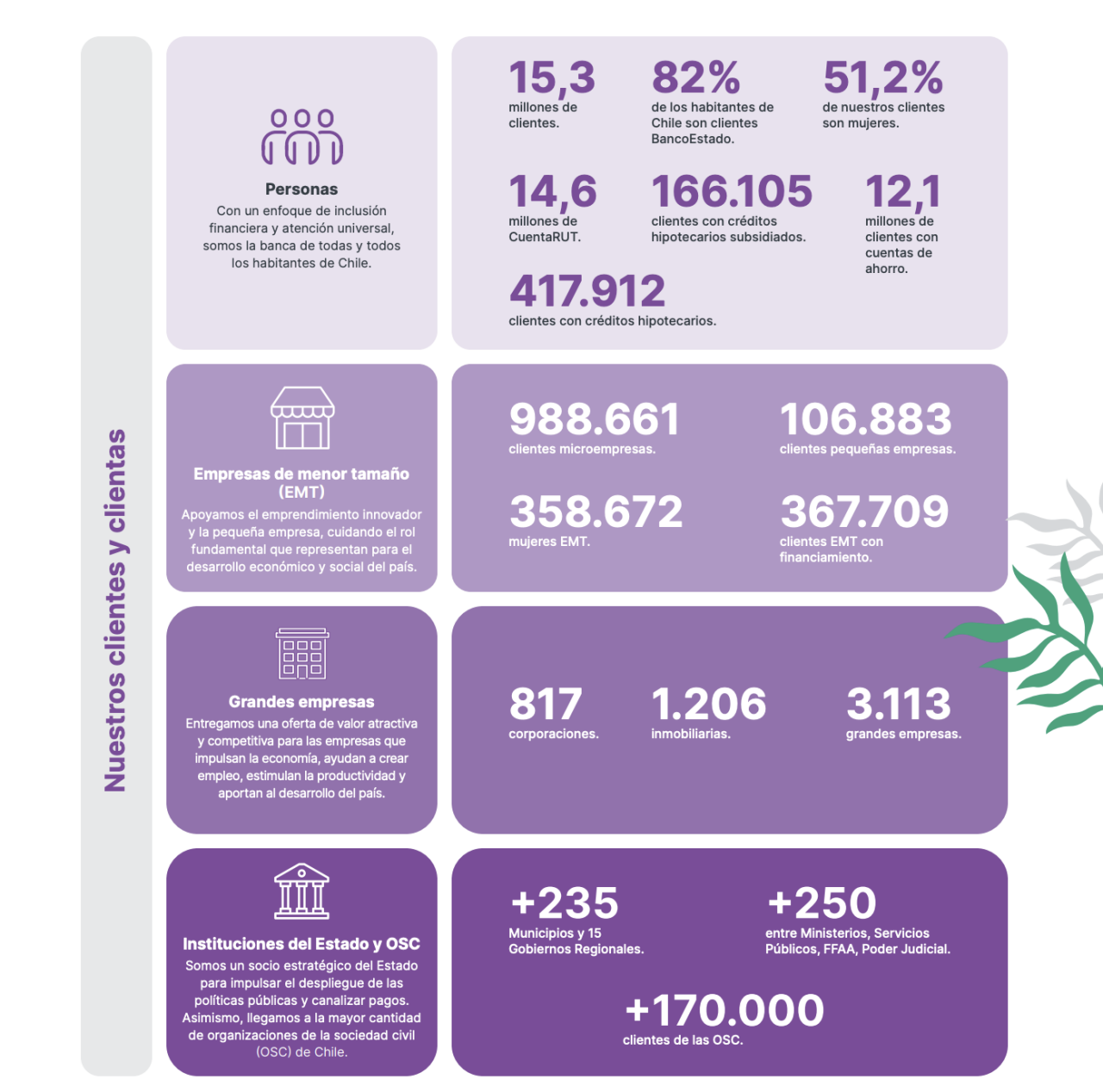 BancoEstado tiene más de 988 mil clientes microempresarios y más de 106 mil clientes pequeña empresa, al término del año 2023. A través de una banca especializada, apoyamos a las Mipymes durante todas las etapas de su negocio, no sólo con productos financieros, sino también proporcionando asesoría y una oferta no financiera.