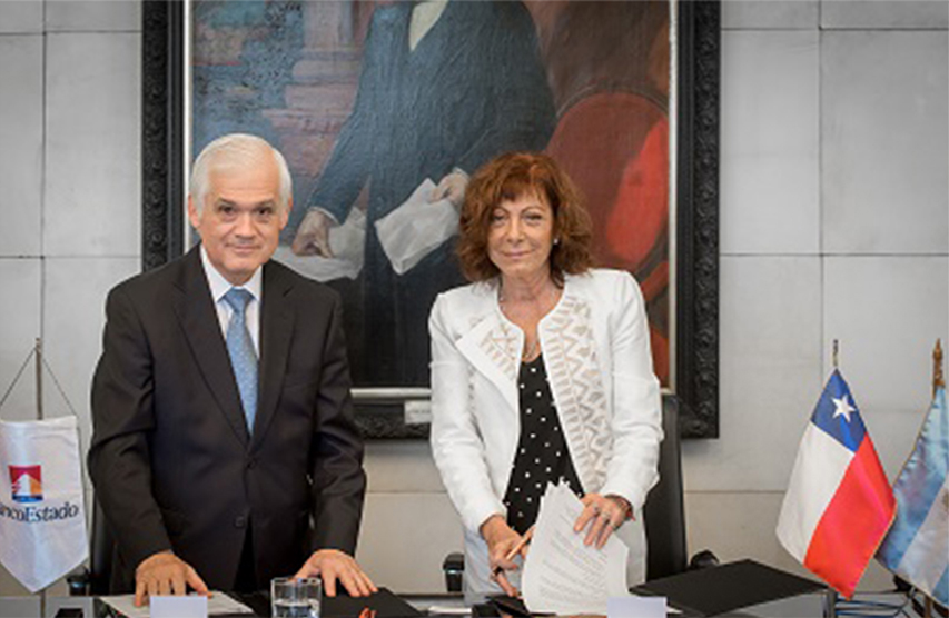 El presidente de BancoEstado, Enrique Marshall, y la directora del Banco de la Nación Argentina, Ercilia Nofal, suscribieron un Convenio Marco de Cooperación entre ambas entidades.