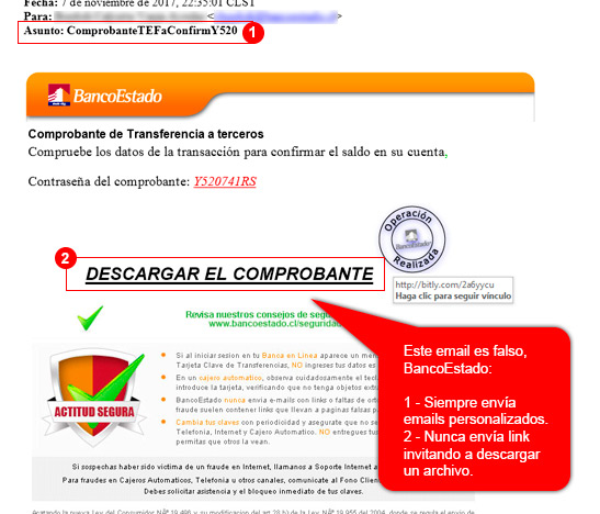 Este tipo de fuente conocido como Phishing, el cual consiste en el envío de mails que suplantan a los de Banco Estado y que buscan dirigirte hacia sitios falsos, donde si ingresas tus datos podrán más tarde, robar el dinero de tu cuenta.