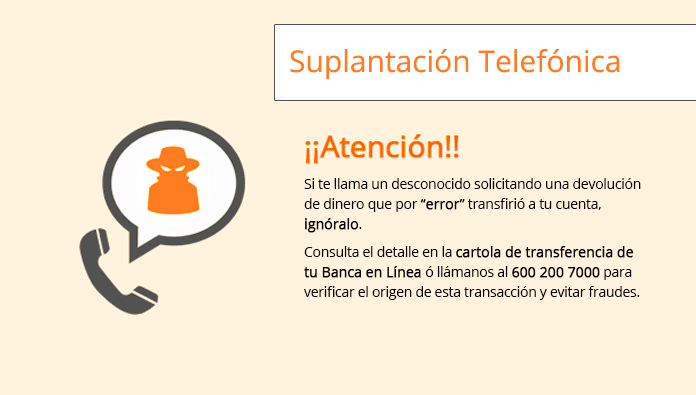 Es una llamada que busca robar tus datos personales. Se produce cuando alguien, se hace pasar por un ejecutivo del Banco y te pide información, sobre tus claves.